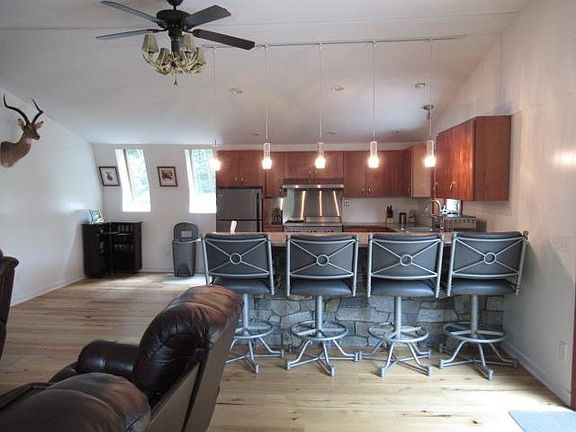 A short drive through the woods brings you to this serene 2 bedroom, 1 bath contemporary retreat on 56 +/- acres. The mudroom includes custom built-in. On the second level you will find a bright, spacious open floor plan with vaulted ceilings. The terrific kitchen offers stainless steel appliances, and custom maple cabinets. The large granite breakfast bar provides additional counter space. The oversized deck overlooking the meadow and pond is fantastic for grilling and enjoying nature. The direct entry oversized garage has ample storage. The property also includes a large unfinished barn/loft which allows for many possibilities. The 56 +/- acres consist of rolling meadows, woods, and trails.