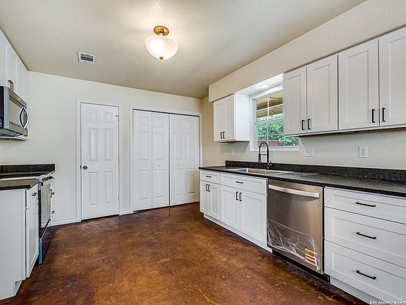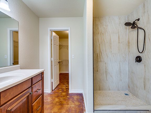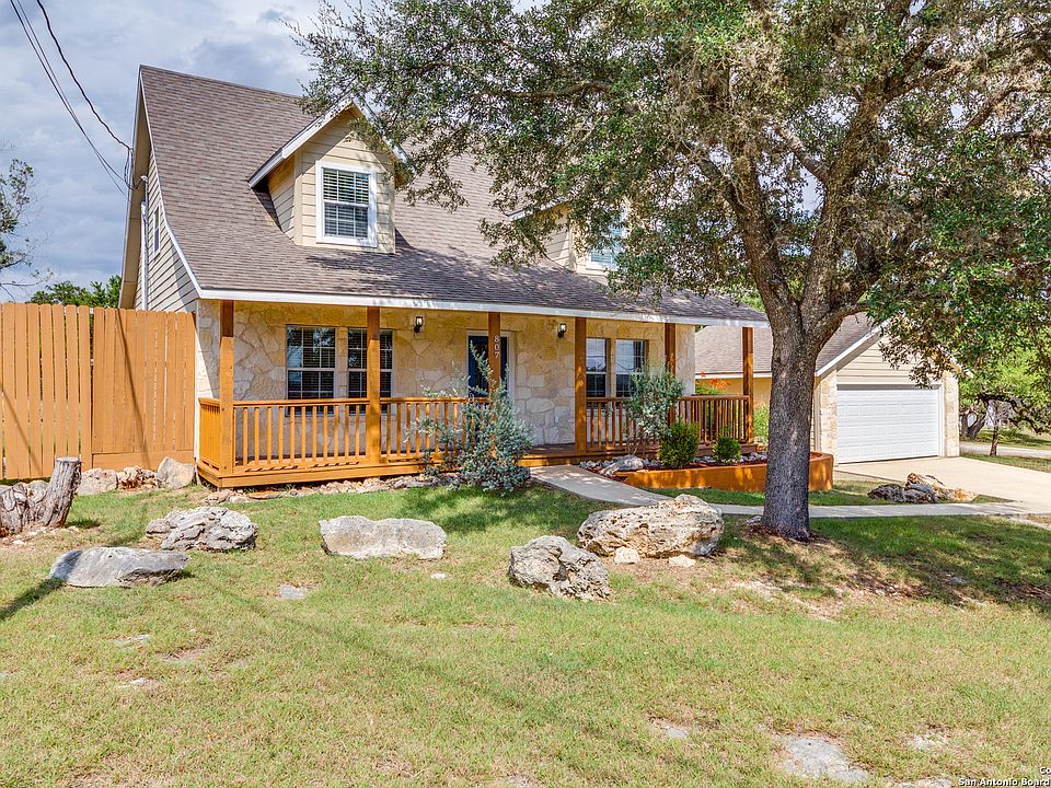 Classic Hill Country Charm Meets Modern Comfort! Discover this spacious 3-bedroom, 2.5-bath home with a 2-car garage, perfectly situated on a .49-acre corner lot in the desirable Bandera River Ranch community. Thoughtfully updated, it features a remodeled kitchen, a brand-new HVAC system, and a beautifully renovated master shower for a fresh, modern feel. Inside, the open-concept design offers generous bedrooms, a striking rock fireplace, and low-maintenance stained concrete floors. Fresh interior paint and plush new carpet make it truly move-in ready. Step outside to two expansive porches, ideal for relaxing with a glass of sweet tea while taking in the Hill Country sunsets and watching deer wander under the shade of majestic oaks. For added privacy or investment potential, the adjoining .60-acre lot is also available for purchase. Neighborhood amenities include private river access, a clubhouse, community pool, playground, and sports courts-everything you need to enjoy the best of Bandera living.