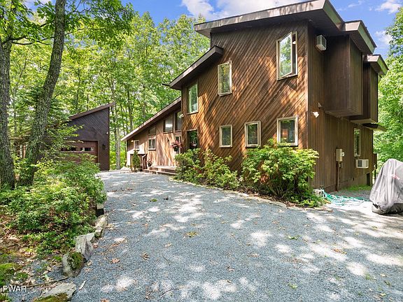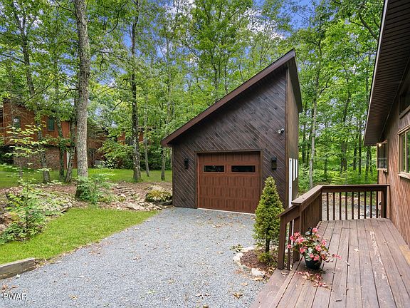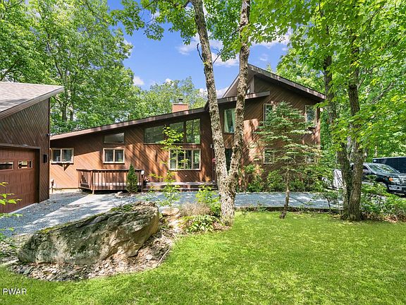 Enjoy unprecedented indoor-outdoor living with this very special light-filled hme on a gorgeous wooded lot overlooking the 5th hole of Lords Valley Country Club. Watch the seasons change through 18' floor-to-ceiling windows. Winters in the quiet cul-de-sa are cozy with the custom stone wood-burning fireplace and a new wood-pellet stove. Take in the mountain air during spring, summers and falls on the enormous wrap-around deck and screened porch. With three bedroom, 2.5 baths, and an office loft, there is plenty of room to live, play and work! Updates include a brand-new custom-built 1.5 car garage with attic storage, pine ceilings, new paint throughout, updated bedroom light fixtures, GE refrigerator (2020) and more! Generously sized owner's suite with two closets (one walk-in),