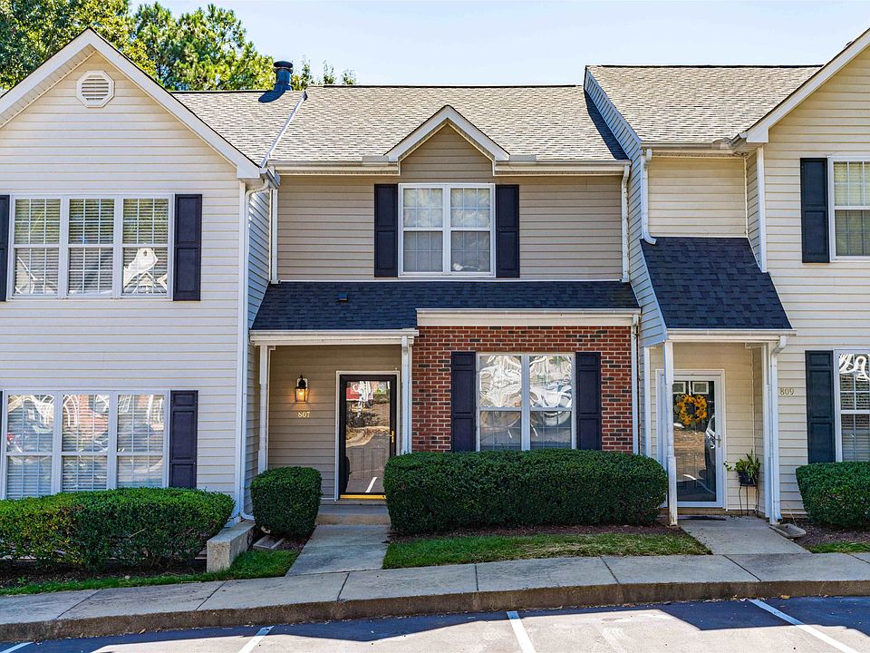 Gorgeous, updated, move-in ready home with open floor plan, 9' smooth ceilings, new carpet throughout. Beautifully remodeled kitchen has granite counters, coffee area, updated cabinets and stainless steel appliances. Half bath on main has updated cabinet, flooring and fixtures. LVP in kitchen and bathrooms and upgraded ceiling fans. Utility room and large closet on main floor. Private fenced back courtyard with patio and storage area. New roof in 2021. The stainless steel refrigerator conveys. Minutes to North Hills, Shelley Lake, I-540, shopping, restaurants and YMCA.