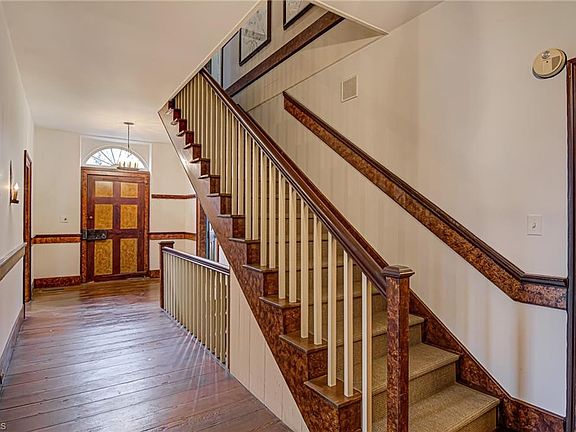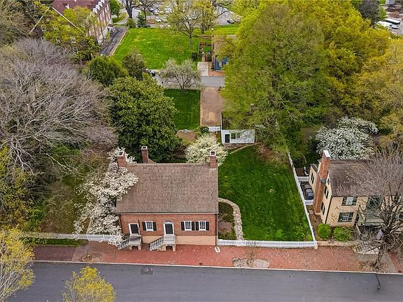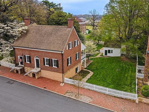 The Traugott Leinbach House c.1824 was built by Salem’s silversmith. The house was reconstructed in 1974 with exacting attention to detail. It features handsome handmade brick, Hendricks Tile Roof, copper gutters, amazing antique hardware, locksets, handmade lighting fixtures, antique mantels and millwork. The house has three bedrooms all with ensuite baths/dressing rooms. The primary is located on the main floor and features a working fireplace as well as the large living room with fireplace and built-ins. The front-to-back foyer opens to a wonderful porch. Downstairs is a great room with walk-in bar, fireplace, handmade brick flooring, full bath and a large eat-in kitchen, also with a fireplace. This level opens to a covered porch and stone terrace. The detached guesthouse/office has about 300sqft and a full bath. The large fenced yard is private and opens to a parking court with aggregate paved drive. Truly one of Old Salem’s finest homes. Much supplemental information is available.