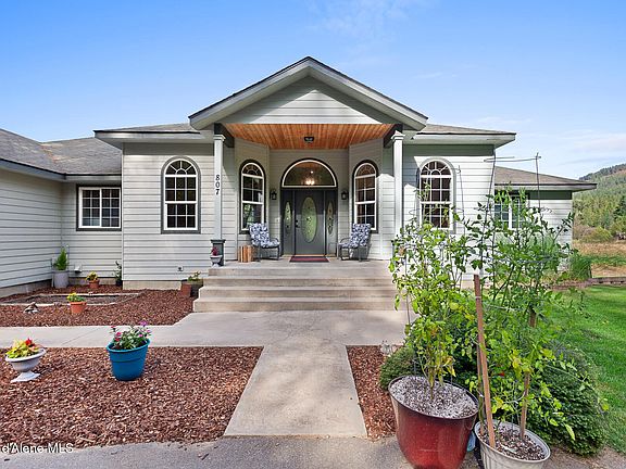 breathtaking views of the surrounding mountains and serene Sagle Creek, which flows through the property year-round. Enjoy the convenience of main floor living with 5 spacious beds, 3 remodeled