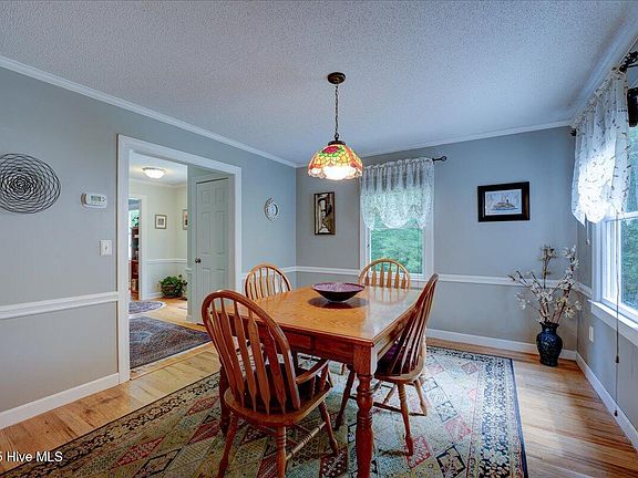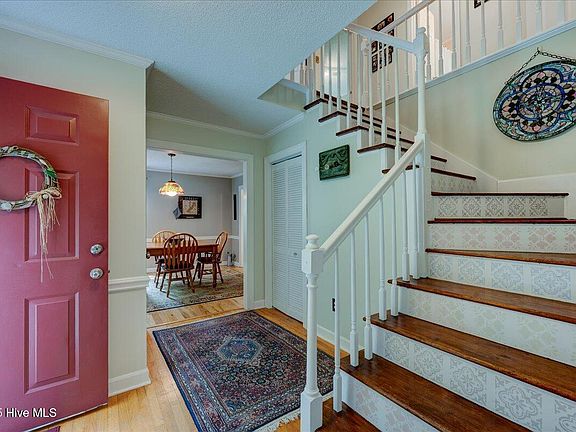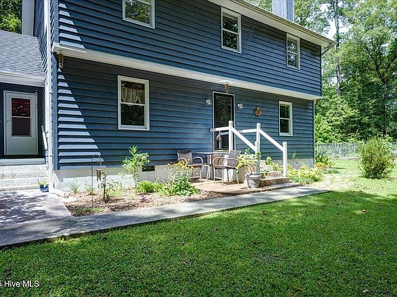 Nestled in the trees in a quiet neighborhood near the Neuse River, this spacious home offers skylights in the living room, granite countertops in the kitchen, hardwoods, & screened porch for year-round enjoyment. Four bedrooms upstairs include a primary suite w/walk-in. Hot tub, patio, gardens & wildlife await. 2 sheds + garage/workshop. Unfinished FROG has potential. Property abuts the Croatan National Forest. The Neuse River is nearby, 10 min to MCAS. No HOA, no city taxes, low flood risk.