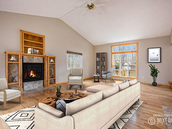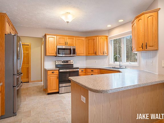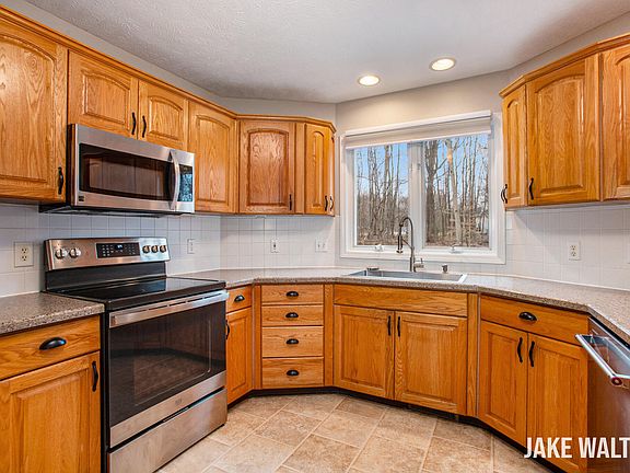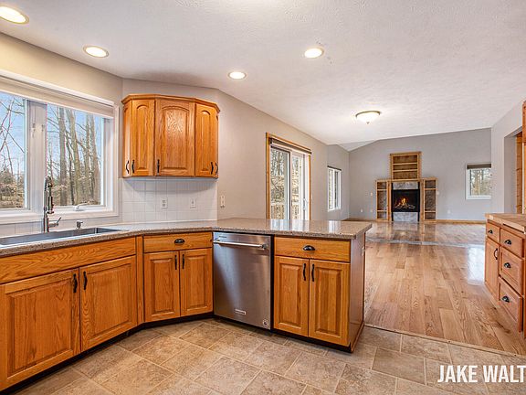 WOW! This spacious home on 1.55 acres is a must see. The home is on a cul-de-sac street & backs up to woods. The sellers have added so much to this home including a front deck & a larger deck on the back looking out on the woods. You'll love the living room w/ cathedral ceilings, newer oak flooring, a new window looking out to the large front yard & a newer warm gas fireplace. The large dining & entry also have newer oak flooring. The spacious kitchen has lots of cabinet & pantry space, granite counters & stainless appliances. A half bath & laundry finish off the main floor. Upstairs is a large master suite w/ walk in closet, large stand up shower, & tub. 2 more bedrooms & a full bath are also upstairs. The walkout basement has a large rec room with newer wood stove & kitchenette along with another full bath. There is also a large utility/storage room. The seller recently had the main floor painted, and also replaced some carpet upstairs and in the rec room along with a new tile floor in the bathroom. If you love the outdoors, you'll love this lot. The seller took out a number of trees to add some yard space, but there is still lots of woods to enjoy. There is a small fence in the back yard along with an invisible dog fence. Some of the many features include a Generac whole house generator, lots of great landscaping and leaf guard on the gutters. Don't miss this great home in a great neighborhood not far from M6, M37 and 96. Call today!