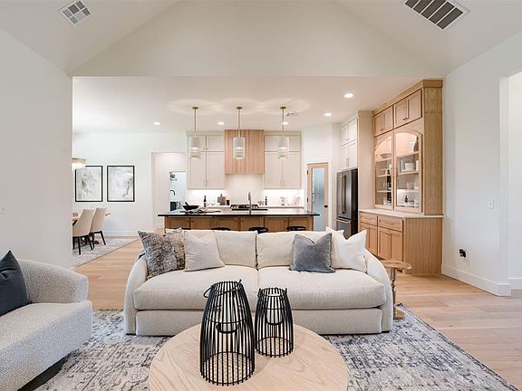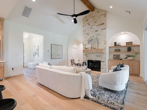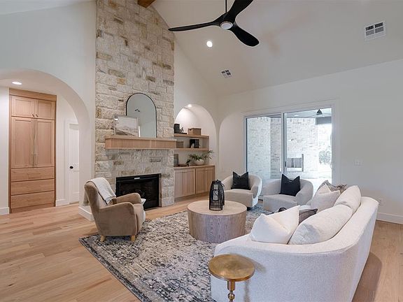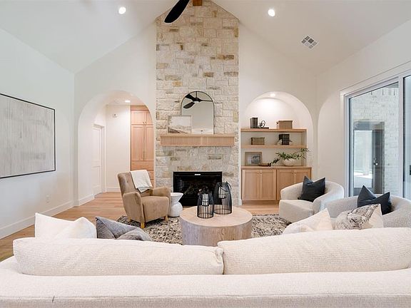 Enter through the stunning foyer that flows into the family room boasting a cathedral ceiling, rock fireplace and arch top white oak built in cabinets. Kitchen amenities include GE Cafe range, dishwasher and refrigerator in a classic Black Stainless Steel finish that give the kitchen a modern yet cozy vibe. The spacious walk-in pantry features a built in microwave, drawers and bountiful adjustable shelves to easily organize cooking and baking supplies. The master bath includes an arch top shower, freestanding top with an arch top window and an oversized vanity which includes a linen, makeup sitting area and lighted vanity mirror.