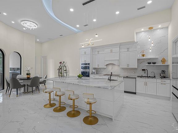 This exceptional, architecturally designed residence blends striking scale, thoughtful craftsmanship, & refined luxury into a home that feels impressive & inviting. Set on a 0.79-acre lot, the property immediately captivates w/its dramatic 24' front porch tower, soaring to a 32' roof peak—a bold statement that sets the tone for what lies beyond. Inside, 5,000 S/F of beautifully curated living space unfolds w/intentional openness and flow. Ceiling heights range from 10 feet to over 16’5” in the Great Room, where custom ceiling designs, floating architectural walls, & a stunning 6-foot crystal chandelier create a sense of volume & elegance. A 45-foot open span & expansive 16-foot sliding glass doors invite natural light & seamlessly connect indoor living w/the outdoors. Every finish was selected for beauty and longevity. High-grade tile & luxury vinyl plank flooring extend throughout the home, front porch, & covered lanai, while 48-inch wide hallways & 8-foot solid doors enhance the home’s grand, custom feel. The kitchen is the heart of the home—anchored by a statement 9’5” x 5’ Dolomite island, dual glass-front refrigerators, custom cabinetry, & an elegant in-wall wine cabinet, making it equally suited for everyday living & entertaining. Five spa-inspired bathrooms elevate daily routines w/floating vanities, frameless glass showers, smart bidets, touch-free fixtures, & illuminated mirrors, offering a retreat-like experience throughout the home. Outdoors, the property transforms into a private oasis featuring approximately 6,000 S/F of pavers, a circular drive, privacy fencing, & meticulously curated landscaping with mature palm trees, Zoysia grass, & white marble stone accents—all supported by a dedicated irrigation system. With integrated security, mobile-controlled systems, and enduring construction throughout, this home is more than a residence, it’s a thoughtfully crafted lifestyle, designed to be experienced, enjoyed, and admired for years to come.