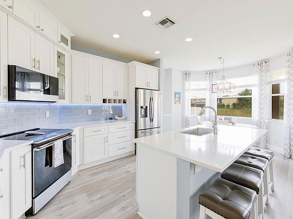 Welcome to this spacious 2-story 4 bedroom, 2 1/2 bath. 3-car garage home in the highly desirable gated community of Isola Bella. The home sits close to the end of a quiet cul-de-sac and has an unobstructed rear view across the beautiful lake. Downstairs you will find the remodeled white kitchen which looks out into the family room and offers beautiful quartz countertops, modern soft-close cabinets, upgraded pull-outs and pantry, and upgraded stainless steel appliances. You will enjoy the generous dining area that provides enough space to serve up a holiday feast or to house a pool table. Downstairs flooring has been replaced with luxury vinyl planking (LVP). Modern LED hi-hats have been installed throughout the house, most of which are on dimmers as well as changeable color LED lights under kitchen cabinets. Upstairs there are 4 bedrooms including a sizable Master, loft, and a laundry room. The ensuite master bathroom has been entirely remodeled with quartz counters, cabinets & fixtures. The majority of the home benefits from newer paint aligning with modern hues.