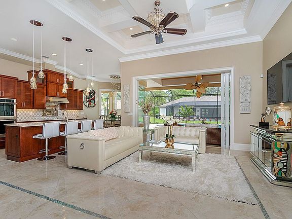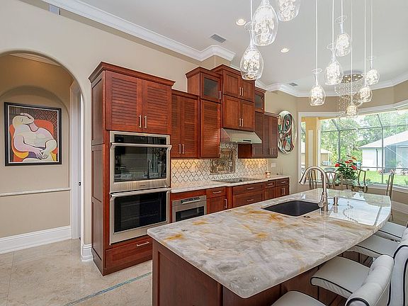 Welcome to 8074 Wiltshire Dr! This stunning custom builder's luxury model home has never been lived in and is ready for immediate occupancy. The Great room features soaring 12-14' ceilings with custom moldings, in-laid flooring designs & high-end finishes everywhere. Enormous outdoor entertainment area with custom, built-in summer kitchen and automatic storm fabric roll down shutters which enclose the entire lanai when desired. A pool bath gives immediate access from the lanai. The kitchen features custom cherry Antigua cabinets, state-of-the-art appliances, Cristallino quartzite countertops with under-counter lighting on the island, and marble backsplash with in-laid mosaic design. Wrapping around the breakfast nook is a huge 9' high aquarium glass window which lets in tons of light and gives a perfect view to the pool area. The Master suite shows beautifully with Brazillian Pecan flooring, backlit moldings, his/hers closets, separate vanities with custom glass sinks, arched mirrors and an incredible Roman shower with seat & multiple shower heads. Insulated & air-conditioned garage with epoxy finish, impact windows, wrought iron front door, integrated storage shed, travertine pool pavers, specialty light fixtures & plumbing fixtures. Honestly, too many features to list, come see for yourself! Fully furnished, if desired. Make your appointment today to come see this impressive and attention to detail home.
