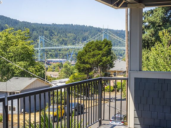 Stylish and totally turnkey, this 4-bed, 2.5-bath home offers over 2,000 sq ft of light-filled living with amazing views of the St. Johns Bridge. With three distinct (and covered) decks and balconies, this house is built to entertain and enjoy the beautiful surroundings any time of year. Inside you'll find an open floor plan, engineered wood floors, new carpet, a gas fireplace, and a sleek kitchen with quartz countertops, stainless steel appliances, and a large island perfect for gathering and entertaining. The spacious primary suite includes a walk-in closet and ensuite bath with soaking tub that features views of the St Johns bridge. The primary suite also has a covered balcony with breathtaking bridge and mountain views. One bedroom on the main level gives you flexibility for a home office, gym, or media room. Outside, enjoy a private fenced yard and off-street parking with tuck-under garage. Just blocks from the river, parks, and St. Johns shops and restaurants! [Home Energy Score = 5. HES Report at https://rpt.greenbuildingregistry.com/hes/OR10240345]