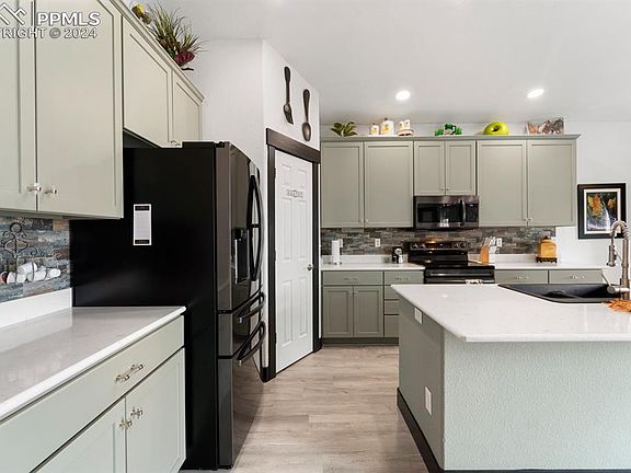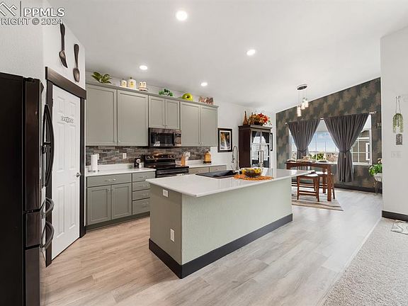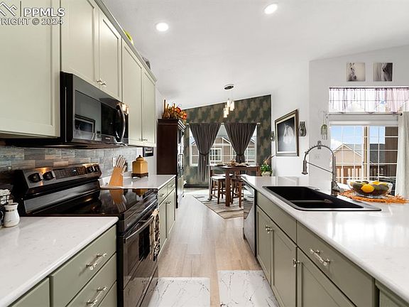Stunning 4 bedroom ranch style home available in Banning Lewis Ranch! Pride of ownership shines through every detail of this amazing home. New zeriscape/turf landscaping, flooring throughout, gorgeous paint and complimentary wallpaper, new kitchen counters/cabinets/appliances, shiny new kitchenette in walk out basement, drip system fed garden beds and more! Covered front porch enters to inviting flowing main level floor plan. Living room with vaulted ceilings, cozy gas fireplace and built ins. Large kitchen features quartz counters complimentary cabinetry, backsplash, large pantry, and newer black stainless steel appliances. Flex space on main level makes a great office/formal dining/playroom/etc. Walk out to composite deck with breathtaking Pikes Peak view! Master suite on main level features attached 5 piece bath with dual vanity, oval soaking tub and walk in closet! Additional bedroom on main level with window seating. Walk out basement includes large family room with electric fireplace and kitchenette! 2 additional bedroom in basement and jack and jill bath! Large storage room could be finished out to another bedroom! Newer water heater and central air! Located on a cul-de-sac in coveted Banning Lewis Ranch neighborhood with top of the line amenities, this home truly has everything you need- all that's left is to move in!