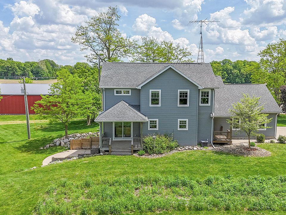 Tucked behind a cherry orchard on 8+ acres is this well-maintained 3 bed/2.5 bath home. Completely surrounded by farmland, the country setting is easy to fall in love with. The property features a 80x60 pole barn with a work shop that's equipped with cement floors, heat, water hookup & electricity (2 panels; 200amp & 100amp). The home was built in 2005 with 2x6 walls & includes an attached 2-car garage, main level laundry & a finished walk-out basement with a wood stove hookup. The walk-thru kitchen offers a pantry space and access to the covered deck. Both the dining and living room showcase the beautiful views of the backyard. The upper level holds all 3 bedrooms where the primary suite features a walk-in closet and private bath. Home is equipped with MEC's fiber internet.