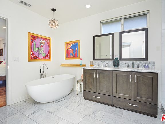 This residence is a gem to behold in the heart of the historic preservation district, adjacent to Hancock Park. Impeccable inside & out, this 4-bed, 3-bath home is move-in ready boasting a beautifully updated kitchen w/ newer Jenn-Air appliances & wine fridge, Carrera marble countertops w/ peninsula countertop breakfast bar that opens to a formal dining area. Large glass patio doors open to a lush backyard perfect for entertaining. 1 bedroom located downstairs w/ beautifully designed built-in desk & shelving w/ cozy fireplace. The 2nd floor luxurious master bedroom includes a large closet, updated marbled bathroom w/ freestanding tub, separate shower, dual sinks & a bonus sun deck. The home has been updated w/ hardwood floors throughout, large double pane windows providing wonderful natural light, 2 HVAC zones w/ Nest controls, front door iRing, alarm system ready, Culligan water purification & softening system, gated driveway leading to a detached garage w/ an additional storage room.