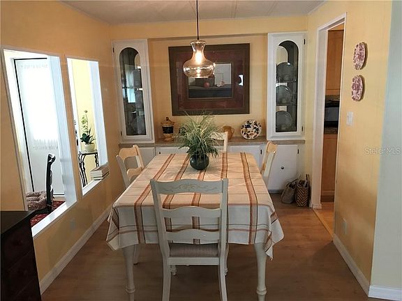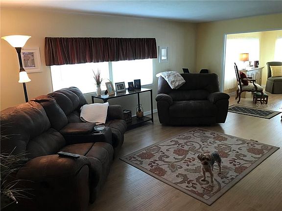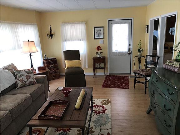 Fantastic find in Palm Lake Estates where you own the land as well as the home. This 55 plus neighborhood offers a community pool, library, and clubhouse where year round activities and events are held. Low monthly fee of $127 includes your water, sewer, trash and basic cable. This 2 bedroom, 2 bath home has been expanded to incorporate the front room to be included in the square footage as it now has air-conditioning. New windows in 2008. In 2014 the roof, gutters, breaker box and surge protector were done over. New hot water heater in 2015 along with new tall toilets and the kitchen appliances. New plumbing in 2019 as well - nothing left to do except move in. Screened in lanai located right behind the car port - plenty of storage. Lake provides the water for the irrigation system. Must have 700 credit score.