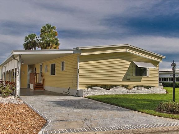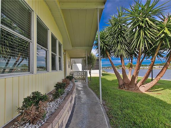 Waterfront Home located in a 55+ Active Community - Palm Lake Estates. This home has an open concept, living room has beautiful view of the 5 acre lake. Open kitchen with breakfast bar, range is in the middle of the kitchen, double oven and a skylight. Living room has built in shelves and a fireplace. Separate dining room. Master Bathroom has his and her sinks and a walk in closet. Glassed in Florida Room, Updated glassed in Lanai and a screened in porch which has the view of the lake. Your washer and dryer are located inside the home. Extra storage in the utility shed. Low maintenance fee of only $140/month includes: water, sewer, trash, cable, internet, pool, clubhouse shuffleboard, and office manager. Located near shopping, banks, restaurants, minutes to the beach's and airport.
