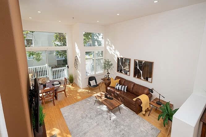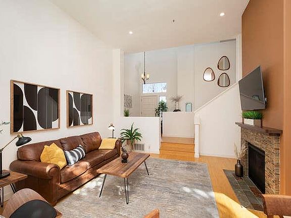 2BR, 2BA, 1513sf. Light streams into this joyful, voluminous, open floor plan. Gracious soaring ceilings crown the living room, which flows into the dining area and professionally updated kitchen. Quartz countertops accent the glass-fronted cabinetry.