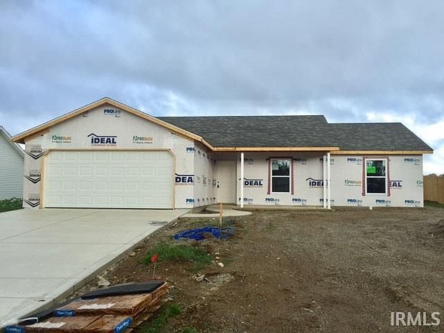 Attractive open floor plan on this Nicholson II with 3 bedrooms and 2 full baths. Great curb appeal with the partial front stone and covered front porch. The foyer entry leads to a spacious great room with cathedral ceiling and backyard view. The dining room has a sliding door to the patio. Kitchen features include a breakfast bar and custom cabinets with crown molding and hardware. Appliances provided are a garbage disposal, stainless steel dishwasher and microwave. The master suite features a custom walk-in closet and full bath with a walk-in shower. The semi-finished garage has an attic access sized for a future pull down stairs, garage door opener and a wireless keypad. Landscape package includes grade and seed plus two trees and 10 shrubs. Ideal provides a 10 year warranty from Residential Warranty Corporation.