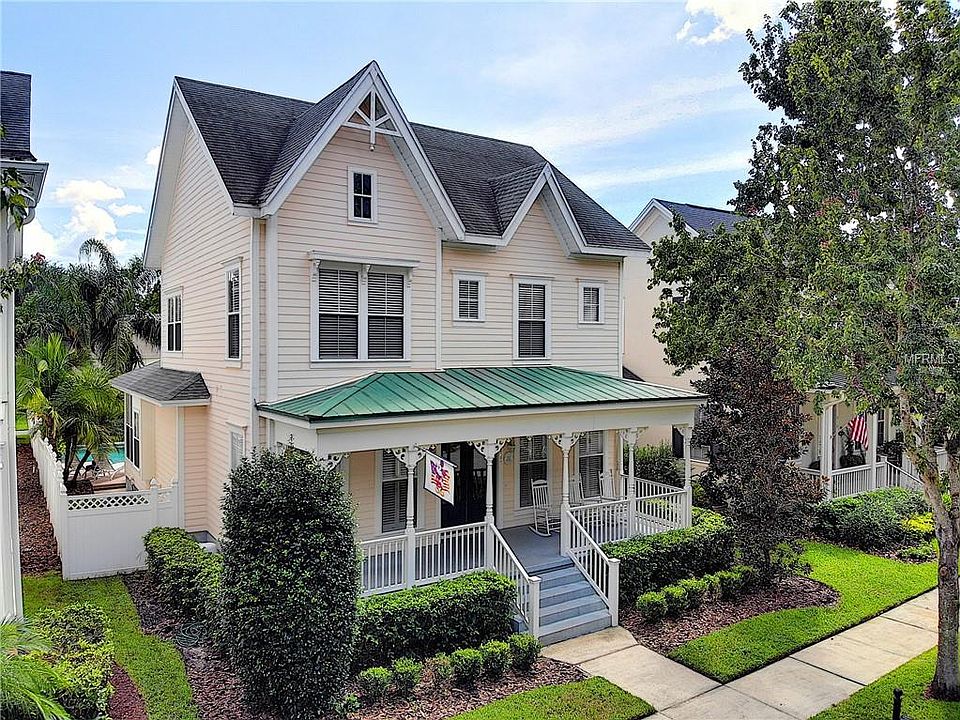 Splash! Get ready for your pool party. This 4 Bedroom home, with Master Bedroom on the main floor, has a beautiful pool & spa with fountains and jets. Take in the beauty of Deer Woods Park from the full front porch. Enter through double front doors, and view the long Victorian window. Plantation shutters in the front area of the home, with blinds throughout the remaining home. This home hosts Living room and Dining room combo, Home Office, Chefs kitchen with new appliances a few months ago, Family Room with beautiful mill work, Breakfast nook and Master Bedroom on 1st floor with views of the pool. Master Bath has separate jet tub and separate shower and has one of the largest closets in this Cottage home series. Laundry room is on the main floor. Upstairs there is a large loft, great for recreation or additional office space and 3 additional good sized bedrooms. Step outside to this inviting fenced in private oasis with custom Pool/Spa and additional yard space. 2 Car Garage with room for 2 additional cars in driveway. Live the Celebration Lifestyle with walking paths, community pools, fitness area at one of the pools, Town Center with Shops, Post Office, Bakery, Restaurants and plenty of Celebration events including Food Truck Night once a month. Come experience the Celebration lifestyle.