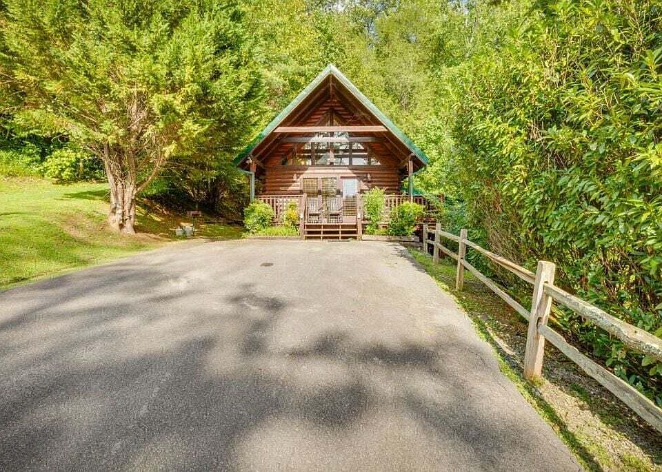The cabin features a hot tub, gas fireplace, pool table, big-screen TV, and access to the Black Bear Falls community pool and splash area. Guests can enjoy a fully equipped kitchen, a king-size bed, a queen sleeper sofa, and an indoor jetted tub. Outdoor spaces include a covered deck with rocking chairs,hot tub and a charcoal grill, and serene pond views.