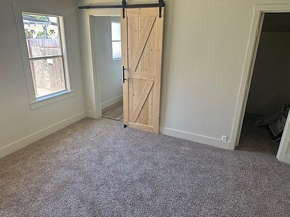 The generous main suite includes a walk-in closet and a stylish main bathroom featuring a tub/shower combo behind a charming barn door.-