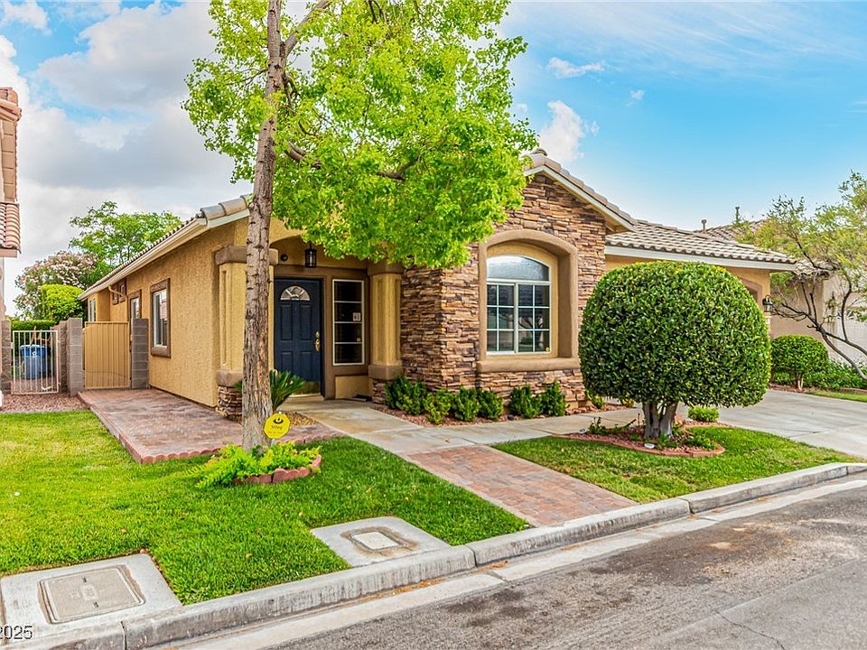 Ready to live in the heart of Summerlin? This 3-bedroom home features a 2-car garage, manicured landscaping, and a stone-accented facade that adds to the home's appeal. Upon entering, you'll see custom paint finishes, a den with a built-in bookcase, plantation shutters in some windows, thick baseboards, a formal living/dining room, and tile/carpet floors. You'll love the family room boasting a gas fireplace for those cooler months! The kitchen includes built-in appliances, a pantry, granite counters/backsplash, a breakfast bar, recessed lighting, and wood cabinets. Continue into the charming primary bedroom, comprising French doors to the backyard for private access and a full bathroom for added comfort. A dual sink vanity, soaking tub, step-in shower, and walk-in closet complete the main bathroom! Spend relaxing evenings in the backyard, offering a covered patio and green grass. You don't have to wait! Move-in ready!