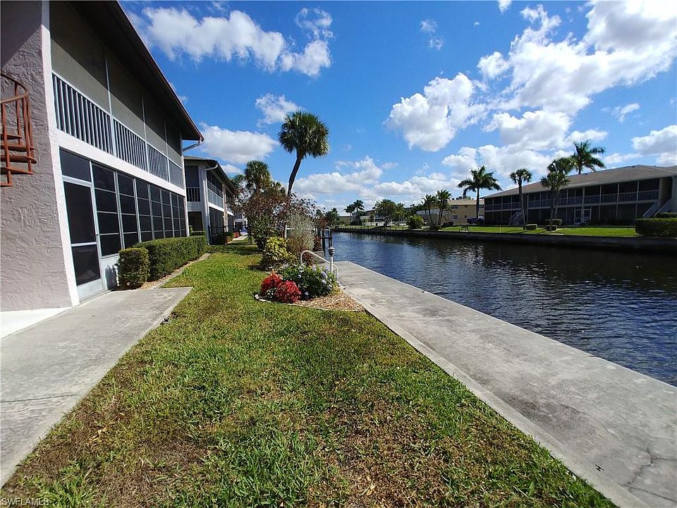 R E D U C E D ! MUST SEE this beautifully remodeled ground floor unit on gulf access waterfront, new and sparkling fresh, ready for your Florida lifestyle! Special features include granite counters, Samsung stainless steel appliances and upscale cabinets & fixtures, clean vinyl plank floors, inside laundry, and plenty of closet space. Also includes extra locked storage room and covered parking. Enjoy a tall cool one and enjoy the view in your huge screened lanai near the dock and swimming pool! This small community for older adults is charming and friendly, just blocks from downtown Cape Coral where you'll be near all the activities & festivities, shopping & dining, and only a few miles from the beach. New water heater, new roof, newer air conditioner. Sold as is with inspections welcome. HOA dues include water and reserves for repairs!