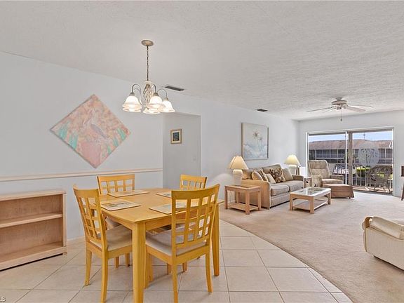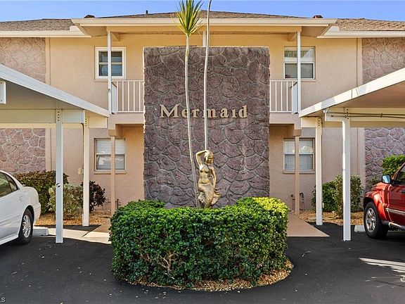 Step into your paradise! The moment you enter, you'll see the bright, open living & dining area. This leads to the spacious patio that overlooks the pool. Comes with manual roll down hurricane protection & pocket sliders, so you can really open it up! Walk into the master bedroom, with a large walk-in closet, vanity, and stand-in shower. The guest room is larger than most masters! Featuring a step-in closet and an office desk with a built in Murphy Bed. The guest bath has a shower/tub combo. This property offers tons of storage space; 2 linen closets, 1 large walk in storage closet, in-unit washer & dryer room, & downstairs you'll find even more storage by the carport! The utilization of square footage throughout this home allows this condo to SHINE! The Mermaid is a 55+ community in walking distance from "downtown" Cape Coral! This home comes TURN-KEY, so all that's missing is YOU! Call today for a private showing!