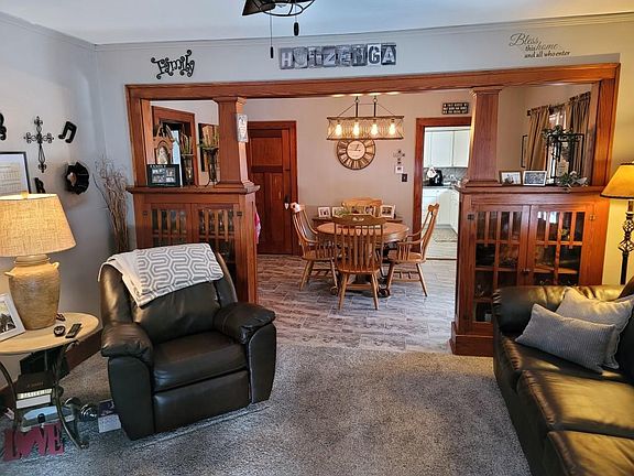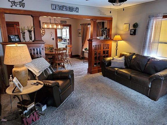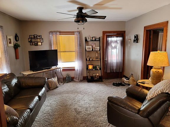 Move in ready, 4 bedroom, 2 bathroom home. 9x20 covered front porch. Updates in 2018 include: light fixtures, carpeting, kitchen cabinets, countertops, sink, backsplash, ceramic tile flooring in kitchen and dining room, remodeled full bathroom, some newer windows. Electric baseboard heat on second level. Furnace and hot water heater new is 2014. Alley access. Updated 100 amp electric. Laundry hook ups in basement.