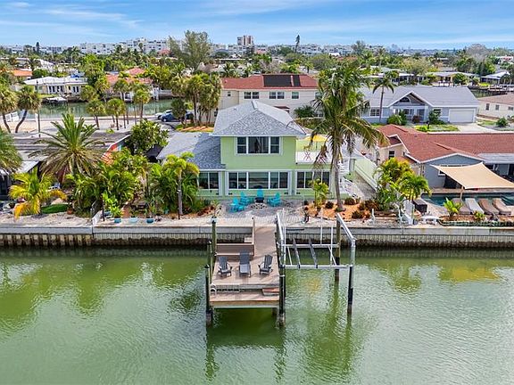 Waterfront home on sailboat water with no bridges to the Gulf of Mexico, located in desirable St. Pete Beach. This well-maintained residence features a 2023 elevated dock and 10,000 lb remote-controlled boat lift with electric and water, offering direct access to open water within minutes. The interior offers an open-concept layout filled with natural light. The updated kitchen with new appliances connects to spacious dining and living areas. The first floor includes a primary en suite bedroom and a second bedroom. The second-floor addition (2000) provides an additional en suite bedroom, office, and bonus room with water views and access to a private balcony. Additional features include newer windows, and hurricane shutters for all openings. Outdoor amenities include a circular paved driveway, xeriscaped yard, enclosed lanai, backyard fire pit, wine garden, and a side yard suitable for boat or golf cart storage. The property is located at the entrance of a cul-de-sac for added privacy. No HOA. Enjoy the ultimate Florida lifestyle just minutes from the white, sandy beaches, dining, and shopping. Move-in ready and built for peace of mind—schedule your private showing today!