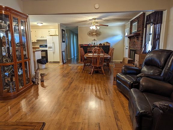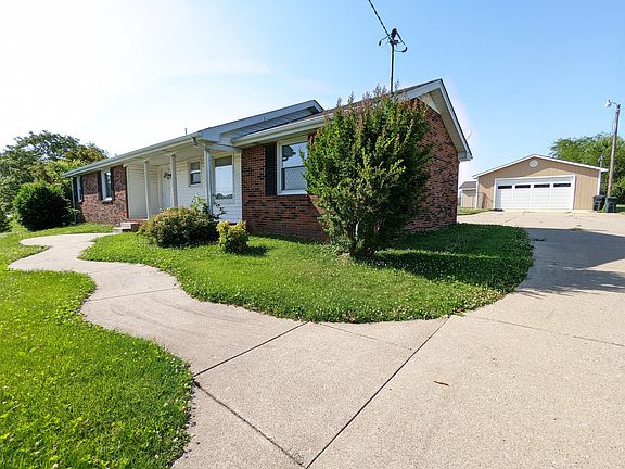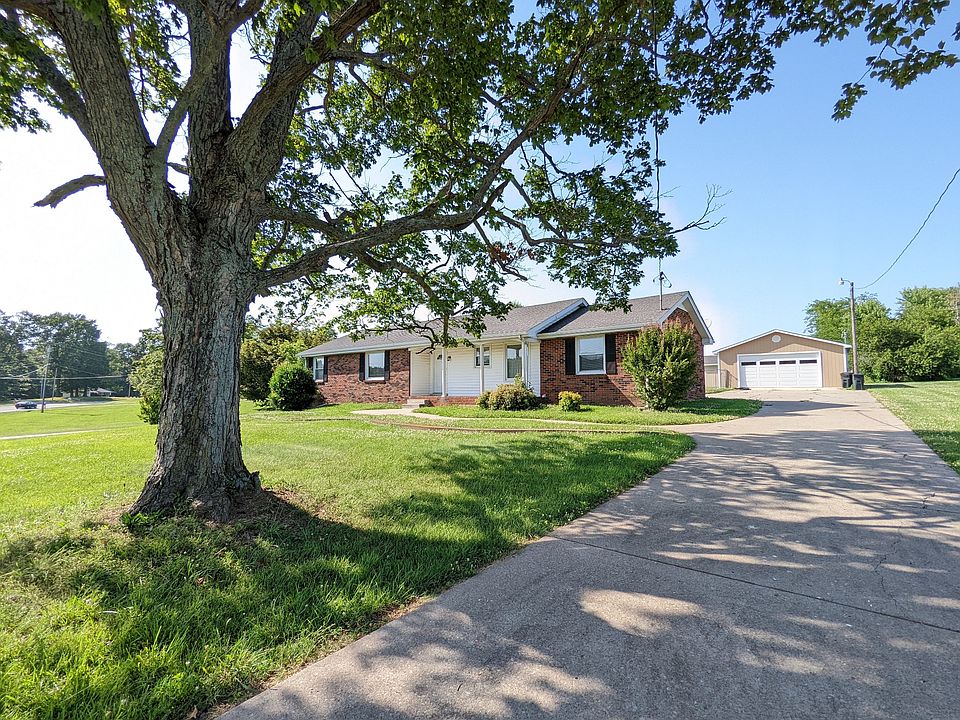 Check out this full brick home! One level. Sits on 1.25 acres and has gorgeous views. 3 bedroom, 2 1/2 bath, open living room, kitchen and dining room with fireplace. Concrete loop around driveway, fenced in back yard, and 2 detached garage. New hot water heater installed 07/07/2022. New HVAC installed 2021. Windows been updated (unknown year). Don't miss out on this home!! Just a hop, skip and jump to interstate I-65.