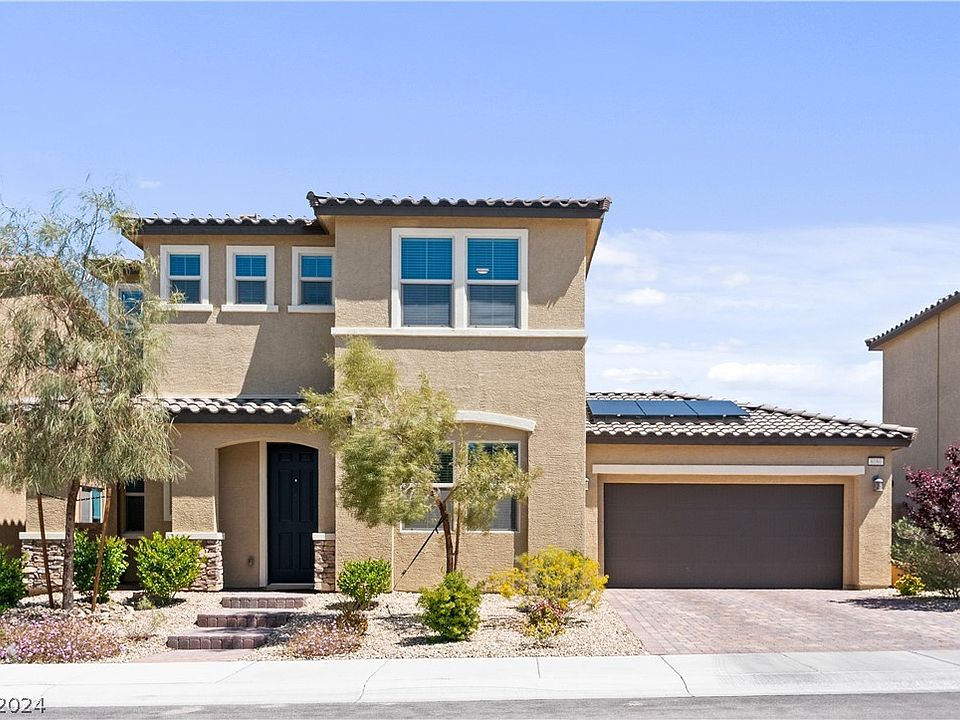 Welcome to luxurious living, where the mesmerizing sights of the iconic Las Vegas cityscape and the majestic peaks of Mount Charleston can be seen directly out your window. This immaculate property is situated in the highly desirable Skye Canyon neighborhood that provides exclusive access to the community pool, clubhouse (with a fitness area), basketball courts, and more! The home is equipped with high-end stainless steel appliances, ring video doorbell, and other luxuries such as solar panels, upgraded tile, padded carpets, upgraded cabinets, and an upgraded primary bathroom!