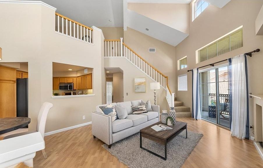 Condo with two bedrooms, two bathroom, and a spacious open loft! Located in the gated community of Viewpoint North in a cul-de-sac next to large greenbelt. Two car attached garage with cabinets and direct access to home. Ground floor entry with stairwell that leads to main floor - bedrooms, sizable living room, and dining room. Living room includes a fireplace and private balcony. High ceilings add to light and bright feeling throughout the home. Kitchen includes stainless steel appliances, maple cabinets, and opens to living and dining rooms. A spacious loft sits above living room and is perfect for a home office or den. Master bedroom offers high ceilings with walk-in closet and dual sink vanity in master bathroom. Secondary guest bedroom also has high ceilings and full bathroom just outside in hallway. Condo includes indoor laundry. Viewpointe North features two pools, five spas, club house and two gated entrances to community.