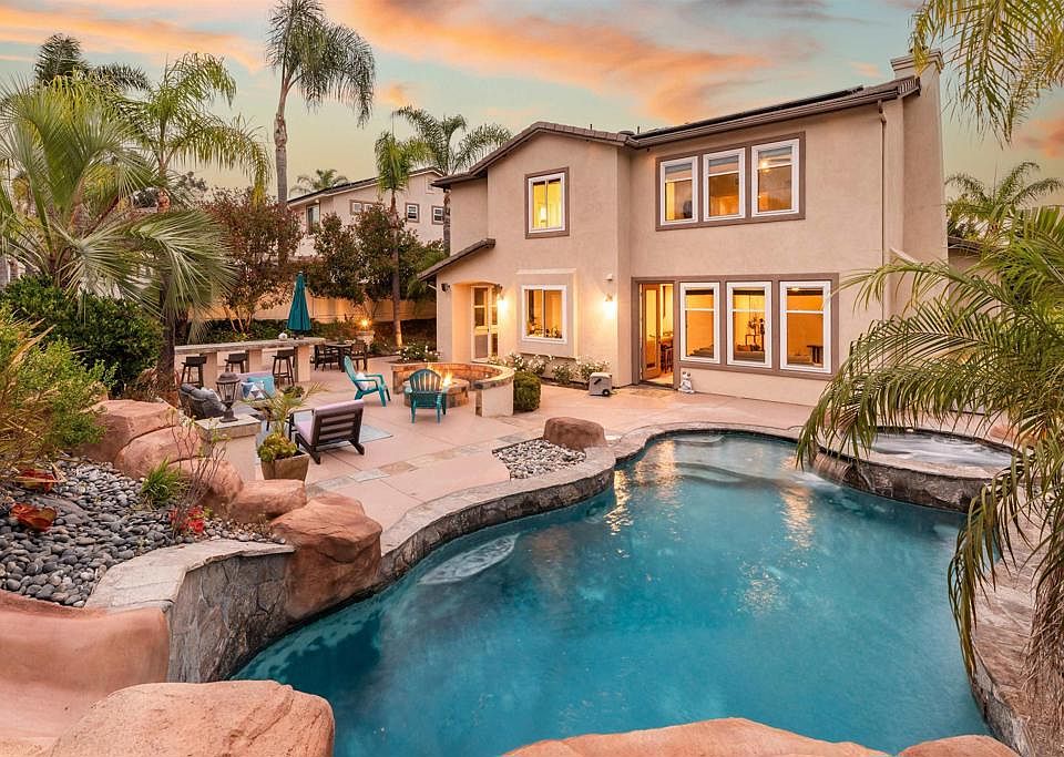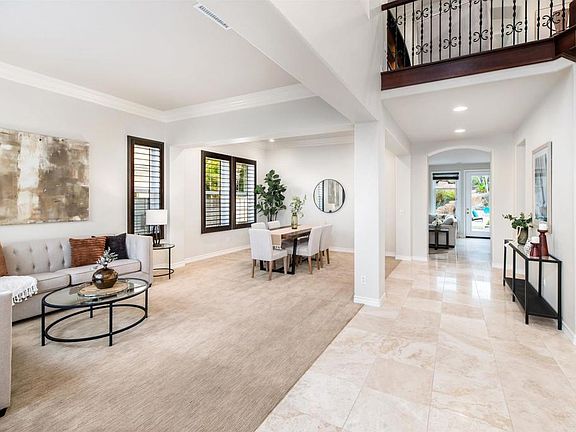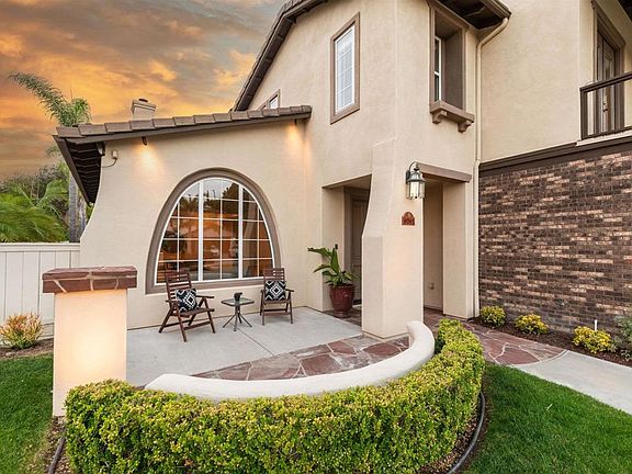 Exquisite La Costa Valley Estate! Nestled on pristine manicured grounds marked by a stunning lagoon & spa, this estate masterfully combines Mediterranean elegance with timeless design, offering the utmost in modern convenience. The refined open interior boasts fresh paint, a main-level ensuite BR, and effortless indoor-outdoor living. Upon entering, you're greeted by dramatic 2 story ceilings, gorgeous stone floors & striking curved staircase. The formal dining room & adjacent living room, w/ plush carpet & crown molding, create an inviting space for relaxation & formal gatherings. The open-concept kitchen & family room, enhanced by multiple sets of glass siders, extend the interior comforts outdoors, creating a spacious, high-end feel. Expansive gourmet kitchen equipped w/ granite counters, island w/ gas cooktop, double ovens & extended breakfast nook w/ built-in cabinets for casual dining. A cozy fireplace & plush carpet add a warm & inviting ambiance to the family room. A second staircase near the laundry room adds convenience. Versatile upstairs loft w/ hardwood floors. The sumptuous primary suite offers crown molding, picture windows & plush carpet. Spa-quality BA w/ dual vanities, soaking tub & spacious walk-in closet. 3 ensuite BRs complete the 2nd level. The backyard is the perfect blend of beauty & function, offering al fresco living beyond compare w/ multiple areas for lounging & dining. The pool features a fun slide. After a dip, relax in the spa or cook at the BBQ island & cozy up around the fire pit. Owned Solar. Enjoy access to Valley Club with a resort style clubhouse, exercise room, Olympic pool, spa, tennis courts & the numerous parks, hiking paths & playgrounds throughout the community. Quick access to I-5 & just a minutes' drive to beautiful beaches. Welcome home!