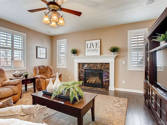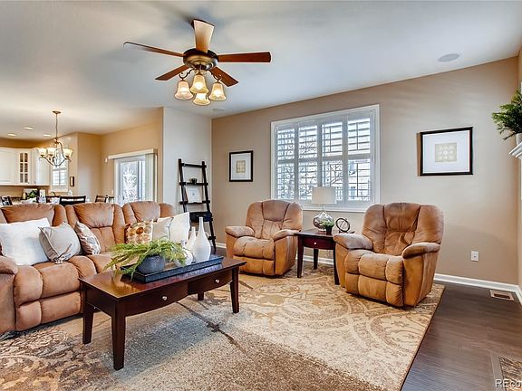 Welcome home to this former Richmond model home in Cobblestone Ranch. As you enter the home you will find the main floor study with built in bookcases and big windows that bring in an abundance of natural light. There are beautiful engineered hardwood floors throughout the main level and the kitchen will surely delight with expansive counter space, large pantry, and kitchen island. A powder room as well as a large family room with a cozy fireplace complete the lower level. Upstairs there is a large loft space, 3 additional bedrooms, a secondary full bathroom, and the expansive master retreat. The 5 piece master bath has a large soaking tub, his and her sinks, and a walk in closet. The unfinished basement provides room to expand and provide your own personal touches to the home. There is an access door from the garage to the backyard which has a large covered patio perfect for Colorado nights. Do not miss out on this beautiful move in ready home.