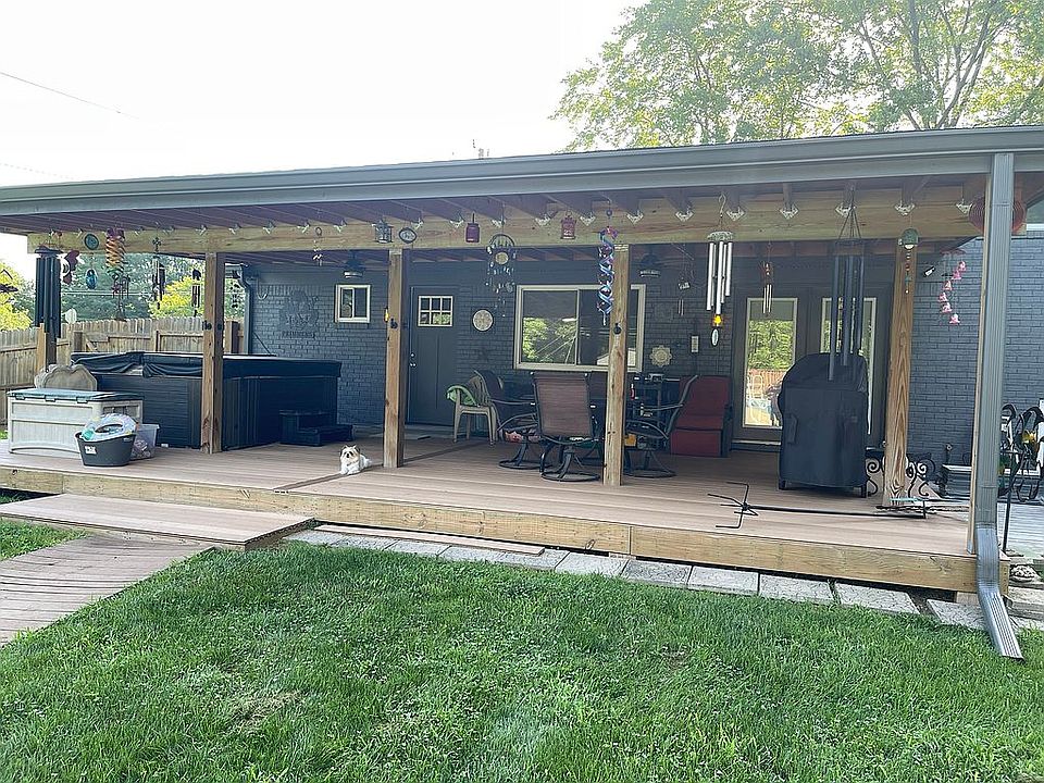 75% Brick with remainder hardy board siding (replaced 6 months ago). Roof replaced 6 months ago. New composite deck 32X17 with 2 ceiling fans added. House is in excellent shape. New air conditioner, privacy fence put up a few years ago.