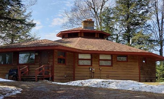 This Unique, One-of-a-kind waterfront octagon-style home features 4 bedrooms and 2 1/2 baths. The back entrance has a foyer which includes a nice large storage/pantry room with slate tile flooring. This leads you into the bright kitchen with plenty of cabinets and a movable triangle island. There is a sub-zero refrigerator/freezer, electric double ovens and a 5-burner gas stove top. A nice large window over the sink brings in natural light and there is a maple wood floor with a dark inlaid outline. Next is a spectacular Great Room with a real "Wow Factor". There is a large stone fireplace with beautiful cedar wood along the sides and the ceiling is lined with T&G cedar wood with skylights and a special octagon design above the fireplace. Windows line the entire room with a panoramic view of the lake. The front door leads to the covered deck which wraps around the front & sides offering more amazing lake views. Off the living room are 2 bedrooms and a full bath. The master bedroom has a half bath and both bedrooms each have 2 closets. The walkout finished lower level includes 2 bedrooms, bath, large laundry area, an extra room currently being used for storage and the Family/Rec Room with another large stone fireplace. This home has lots of storage areas and large closets. There is a detached 3-car garage, blacktop driveway with a nice basketball area with 2 hoops! This property sits on a point with almost 14 acres of wooded land and 696 feet of shoreline with a beautiful sand beach area. Recreational trails are nearby. New Survey. Must See!