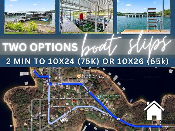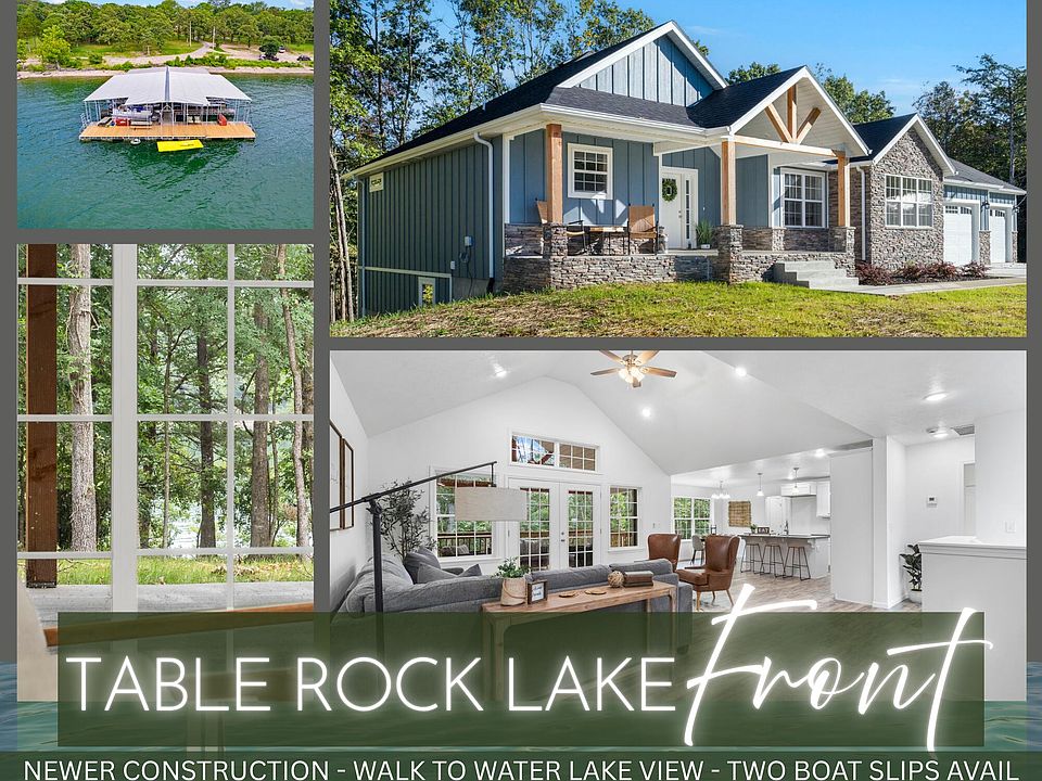 Get out of your car & walk around! You'll be literally 70 steps to the waters edge w/countless evenings enjoying crisp, fresh lake breezes, the waters edge glistening just off your back deck, entertaining golf cart rides to the boat dock for an evening swim, the laughter from a ski boat towing a tuber on a summer's day, the soul comforting sounds of nature (Treefrogs & the Whippoorwill) at night, & the waves breaking gently against the moon adorned shoreline, it's a true paradise. This exceptional, brand spankin new, Table Rock waterfront residence is only a short cart ride to a 10x24 boat slip 75k additional or 10x26 for 65k at rice camp. An entertainer's paradise, featuring: a vast open concept floor plan w/an enchanting window wonderland of floor to ceiling year round lake views flooding in loads of natural light, three(possibly 5) bedrooms & three bathrooms, main level laundry room & owners suite, a sunny office (or bedroom-no closet) w/full bath, multiple outdoor entertaining areas w/12x18 covered deck, lower level theatre room (or bedroom-no closet), two more spacious guest beds & a full bath, family room w/wet bar, all walk-out to your spacious backyard & yep that beautiful #tablerocklake! Everything is HGTV dream home designed: a chef's kitchen with center island for those impromptu meals & cozy breakfast nook, a spa-like retreat in the owners ensuite complete with custom walk-in shower and gigantic walk-in closet. Low maintenance for more time on the water w/LP Smart Siding (30 yr warranty/15 yr paint warranty), R-49 insulation & a three car garage w/9ft. garage doors, & John Deer Room for all the lake toys. A hop, skip & a jump to the highly coveted Coney Island Subdivision, & just min to Kimberling City w/local boutiques/eateries, spas, seasonal farmers markets, grocery stores, less than 10 min. to Reeds Spring Schools, medical facilities, pharmacies,& more. SLIP PURCHASE OPTIONAL. Additional lots on either side of the home are available(additional $$)