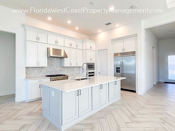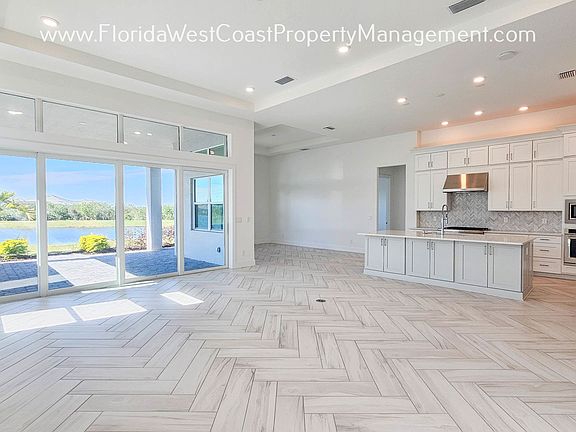 The home boasts 4 bedroom, 4.5 bathroom plus the second floor Flex area and the oversized patio with direct pond views! This new home features an expansive two-level layout with soaring ceilings, crisp herringbone tile throughout and impressive finishes.
