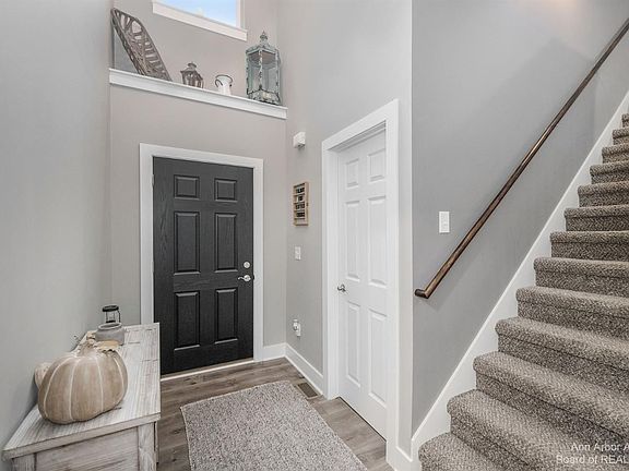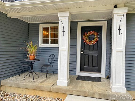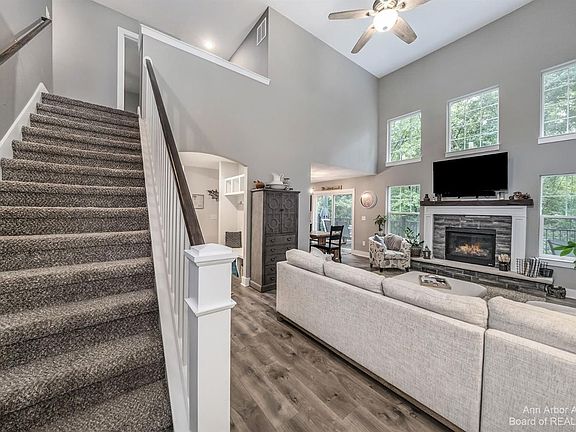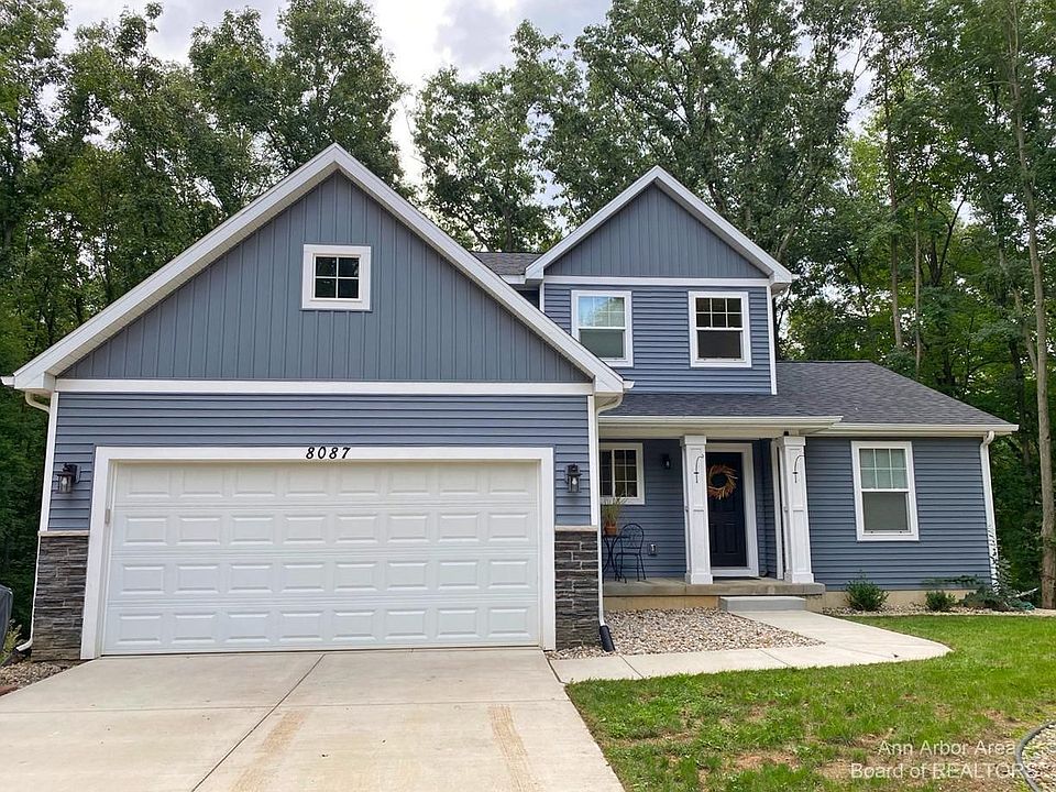 Showings begin October 14. Magical, nearly new transitional home offers an open floor plan with everything on your wish list. Welcoming front porch leads you to the impressive 2-story entry, a centrally located great room and gas fireplace, perfect for gathering and relaxing. Main floor features special touches such as abundant windows, luxury vinyl plank flooring in living areas, barn door on the laundry room, mud room cubbies, 1st floor master suite with tray ceiling, huge tiled shower, sliding door to deck and treetop views. The kitchen features generous counter space, island with barstool seating, stainless appliances and sliding door to deck. Journey upstairs to find two spacious bedrooms, ample closet space, and full bath. The walk-out basement is partially finished and plumbed for a bath. You will feel like you are up north the moment you step on the lovely cedar stained deck spanning the width of the house with panoramic views of woods and wildlife. Located on a quiet private road with mature trees and 2.87 acres. This home will not disappoint. Hurry before it disappears and let me be the first to say, Welcome Home!