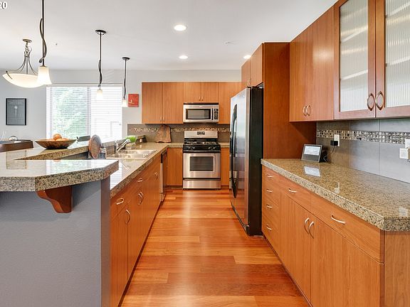 Three bedroom corner unit with incredible natural light and generous living spaces. Set near coffee shops, eateries & green spaces in the heart of St.John's -let your feet do the walking! Open main floor w/mature trees off front balcony + tall windows. Master suite upstairs + 2 more bedrooms; one with built-in office unit. Bonuses: granite counters, pantry, built-in speakers + cherry flooring on the main. Garage located under unit. No rental cap adds future convenience & pets are allowed. A+