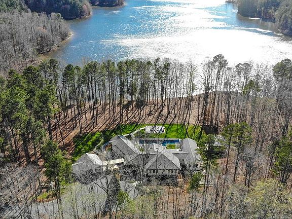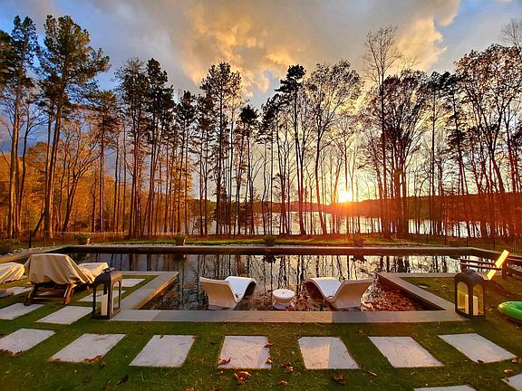 Custom-built, secluded lakefront oasis minutes from Chapel Hill. Form meets function with integrated indoor/outdoor design and detailed craftsmanship. Built for sustainability, this unique home is Green Certified and features reclaimed tobacco barn hardwoods throughout interior and garden with native landscaping. Central courtyard includes Custom Vue pool with raised lounging deck and therapeutic hot tub. The primary wing boasts stunning views and a generous closet/changing room. Across the courtyard is a secondary bedroom suite with an additional laundry area. Large third bedroom overlooks the garden and features a secret storage closet/safe room. Main living area consists of a custom kitchen with a large Carrara marble island, dining space, and an open living room with a wood-burning fireplace, all overlooking Cane Creek Reservoir. Below the pool is a custom-built patio with a large fire pit. Detached studio with mini-split for a home office or exercise space. Raised garden beds with protective fence. Two-car garage with additional storage space. Local builder. Starlink internet.