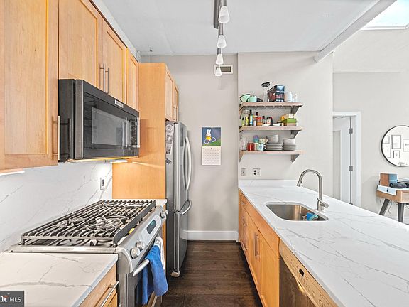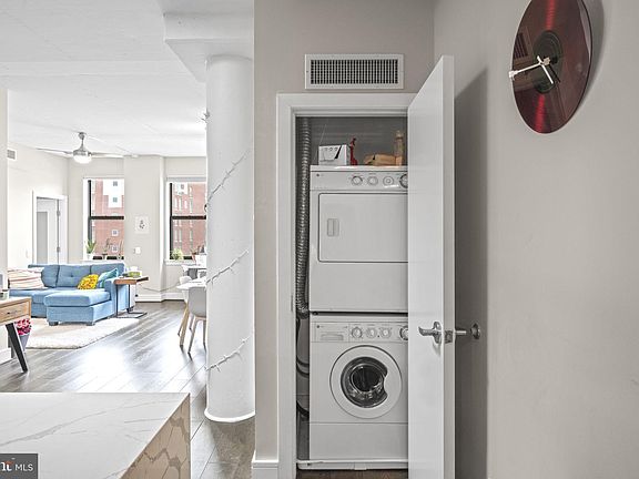 Unparalleled value awaits at Unit 64 — a top-floor, sun-drenched two-bedroom, two-bathroom corner unit with secure garage parking! Spanning over 1,000 square feet of living space, this exceptionally quiet penthouse unit boasts 9+ foot ceilings, exposed ductwork, newer flooring, newer plumbing and updated kitchens and baths. The kitchen features a Calacatta quartz waterfall counter and is equipped with a gas stove, stainless steel appliances, pendant lighting, an under-mount sink, and extra seating for overflow entertaining. Adjacent to this, the sun-soaked open dining/living area includes a skylight, oversized windows, additional storage, and access to the stacked in-unit washer and dryer. The spacious bedrooms offer large, north and east-facing windows that bathe the rooms in both morning and afternoon light. The primary bedroom with en suite includes an oversized walk-in closet, providing ample storage. 6th Street Flats/Chinatown East Condominium, a six-story, 30-resident boutique building, was developed by Bundy Development in 2005 and shares its pedigree with CityCenter, CityVista, and the esteemed Conrad Hotel. Steps away from the city's most vibrant dining, shopping, and entertainment, Unit 64 offers convenient access to I-395 and is within walking distance to numerous bus stops, Capital Bikeshare, and the red, yellow, and green lines at Gallery Place.