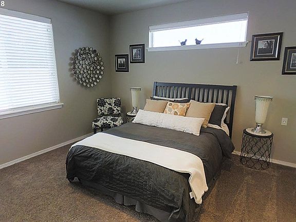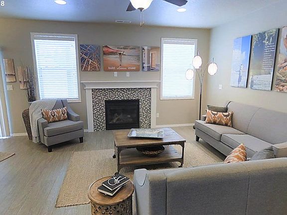 Pictures are of a similar home. Roof pitch is a contemporary hipped roof line. This single level home has an oversized 2 car garage, covered patio,gas FP, SS appliances, quartz throughout, fully landscaped and completely fenced.