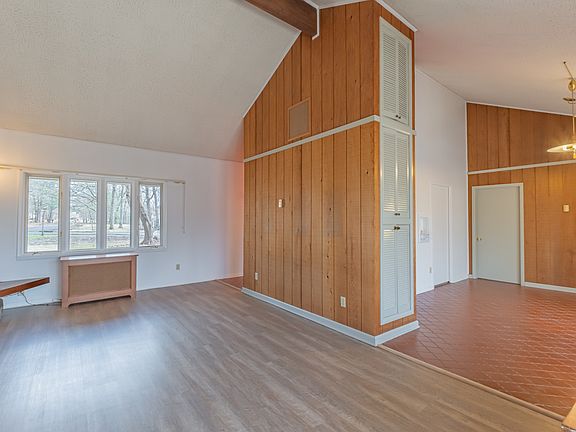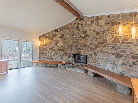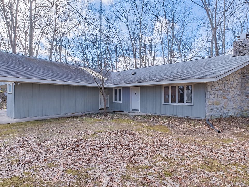 Beautifully renovated mid-century modern home with massive stone fireplace and cathedral ceiling. Office off of Master Bedroom. Spacious rooms throughout. Nice sized patio space for entertaining. Situated on a double wooded lot consisting of approximately 1.24 acres. One year 2-10 Home Warranty provided. This one is a Must See!