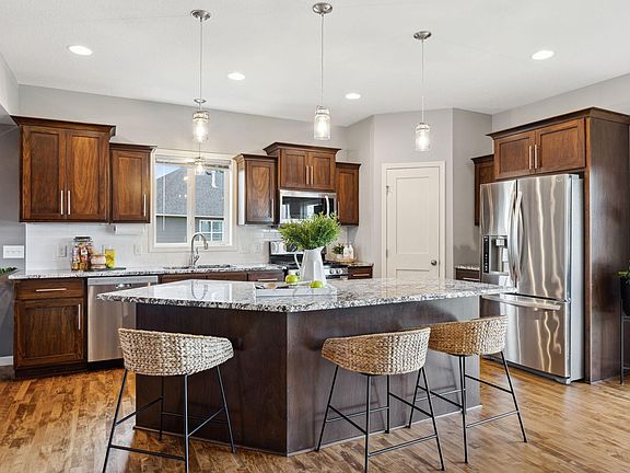 Better-than-new, one-of-a-kind property, in Clover Springs of Delano! Well-built, custom-designed, meticulously maintained, 3BR, 3BA home, situated on a cul-de-sac lot. Fall in love from the moment you walk in, incredibly beautiful hardwood floors, expansive center island kitchen featuring custom cabinetry, granite tops, recessed & under cabinet lighting, tile backsplash, pantry, SS appliances, flowing effortlessly into dining & living rooms w/gas fireplace, & showing off the open floor plan. 2 main floor beds, including primary suite w/2 large, walk-in closets, ensuite w/cultured marble tops, walk-in shower, dual sinks & storage galore. Finishing off the main w/an amazing laundry/mudroom, sink & more storage. Partially finished, walkout lower level w/3rd bed & bath. Additional features include: 9’ ceilings, an oversized 3-stall garage prepped for thermostat & gas, solid panel doors throughout, built-ins, LP Smart siding & an electrical box wired for a welder. Quick close!