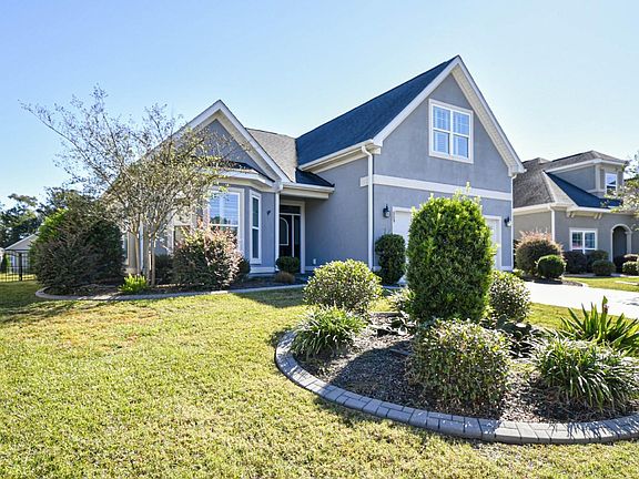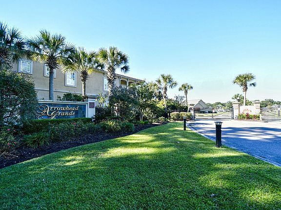Beautifully appointed Mediterranean-style home in the sought-after gated community of Arrowhead Grande! Perfectly positioned on a serene pond lot within this Intracoastal Waterway and golf course community, this meticulously maintained 3-bedroom, 3-bath home showcases quality craftsmanship and thoughtful upgrades throughout. Step inside to an inviting open floor plan featuring vaulted ceilings, archways, and gleaming hardwood floors. The spacious great room flows seamlessly into a gourmet kitchen complete with granite countertops, tile backsplash, stainless appliances, beautiful cabinetry and a breakfast bar perfect for casual dining. The large first-floor primary suite offers tray ceilings, dual walk-in closets, and a spa-like bath with dual vanities and an oversized tiled shower. Enjoy the tranquil setting from your patio overlooking the beautiful, landscaped yard and pond. Upstairs, you'll find a guest/bonus room, a full bath, ideal for visitors or a home office. Additional highlights include plantation shutters, irrigation system, generator, fenced yard, and a finished two-car garage. Arrowhead Grande residents enjoy community amenities such as a pool, day dock with Intracoastal Waterway access, and proximity to Arrowhead Golf Course, River Oaks schools, shopping, dining, and beaches just minutes away. This home truly offers it all - luxury, location, and lifestyle.