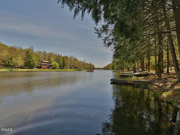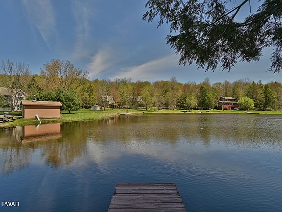 TURN KEY LAKEFRONT HOME ON DEERFIELD LAKE, a quiet lake non powerboating lake in a 4 season amenity filled community in The Northern Poconos, just 2 hours from the NYC and Philadelphia areas. The perfect getaway, situated on a private, wooded, level lot. The main living area is nice and open with pine tongue and groove ceilings, tiled floor, cathedral ceilings in the living room, top of the line JOTUL wood stove, granite tiled counter tops and stainless steel appliances. Amazing knotty pine heated sunroom with wood plank floor plans with lake views! Loft with wooden beams can be used as a third sleeping area or family room. The level lake frontage is amazing with a dock and screened gazebo. Most furniture, canoe, paddle boat & 2 kayaks, fully equipped kitchen included. Escape here!