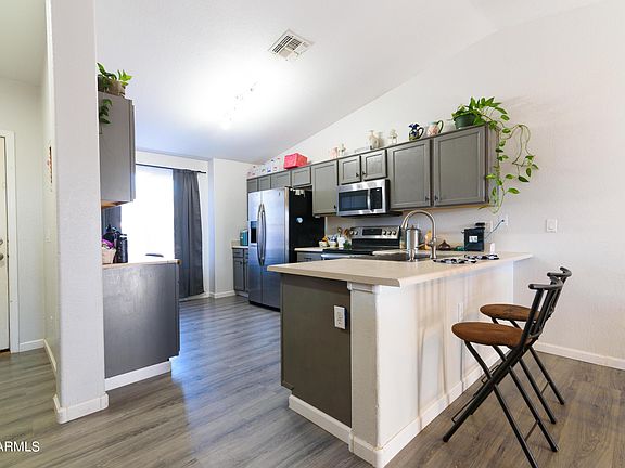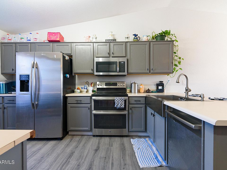 BACK ON THE MARKET! Save with SOLAR! This home has a fresh and stylish color palette with a gorgeous kitchen that offers plenty of storage as well as a stainless steel farmhouse sink. All of the stainless steel kitchen appliances are included, including the refrigerator. Laundry room includes front load washer and dryer. The entire home offers beautiful wood flooring with plank tile in the laundry and bathrooms. This Great Room plan feels open & spacious with vaulted ceilings throughout, including the 3 bedrooms. The owners suite has 2 walk-in closets as well as double sinks in the en-suite. Located in the heart of Buckeye close to schools, shops, and restaurants. The home is located on a cul-de-sac, next door to a large park and greenbelt. Easy to show.