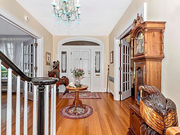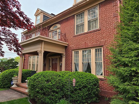 Turn key, move in ready Classic Brick Colonial has wonderful curb appeal with a circular drive, a grand COVERED ENTRANCE WITH DECORATIVE IRON RAILING AND FLUTED COLUMNS. FRONT DOOR WITH LEADED DECORATIVE SIDE LIGHTS OPEN INTO A LARGE FOYER with open grand staircase and oak hardwood floors. TO THE LEFT AS YOU ENTER IS A Formal living room THROUGH DOUBLE FRENCH DOORS. THE LIVING ROOM has a wood stove, BUILT-IN CABINETS AND SHELVING, CROWN MOLDING, DRAPERIES WITH BUILT-IN VALENCE. TO THE RIGHT AS YOU ENTER THROUGH DOUBLE FRENCH DOORS IS A Formal DINING ROOM with chair railings AND ORIGINAL BUILT IN SERVER AND CUPBOARDS. PASSING THROUGH THE DINING ROOM AND ANOTHER SET OF DOUBLE FRENCH DOORS IS A WARM AND INVITING SUNROOM FOR AFTER DINNER CONVERSATION AND DRINKS. THROUGH THE SWINGING DOOR OFF THE DINING ROOM, IS THE GORMET KITCHEN, WITH BUTLER PANTYRY AND A HALF BATHROOM. THE KITCHEN IS FURNISHED WITH NEW STAINLESS STEEL APPLIANCES. UP THE MAIN STAIRCASE TO THE INTERMEDIATE LANDING IS THE FORMAL Library WITH ORIGINAL BUILT IN SHELVING WITH GLASS FRONT DOORS AND ACCESS TO THE ADJACENT EXTERIOR PORCH FOR EVENING CONVERSATION AND RELAXATION. 2 STEPS UP IS THE SLEEPING AREA WHERE YOU WILL FIND THE ORIGINAL BUILT-IN CUPBOARD FOR LINEN AND STORAGE. IF YOU LOOK HARD, YOU WILL FIND THE ORIGINAL SIGNATURES ON THE PLASTER WALL UNDER A PLEXIGLASS PLATE, PUT THER BY THE FOREMAN AND CARPENTERS, WHO WORKED ON THE HOME FROM 1930 -1931. A BEDROOM WITH MANY BUILT IN CABINETS, AND BOOK SHELVES. THERE IS OFFICE SPACE ADJACENT TO ONE OF THE BEDROOMS AND 2 FULL BATHS. THE Upper level has A 5 YEAR OLD, CENTRAL A/C SYSTEM, INSTALLED WITH CIRCULAR SUPPLY AND RETURN OPENINGS IN EACH SECOND FLOOR ROOM. Ample storage in walk up full attic and unfinished basement. THE BASEMENT IS COMPRISED OF 4 SEPARATE WALLED AND DOORED SPACES WAITING FOR PAINT AND FINISHES, AND INCLUDES A COMPLETED HALF BATH. A Detached 2 car brick garage, with parking for 4 in 5 YEAR OLD driveway. Mature landscape outside, with patio, three porches and a large yard. MAIN ROOF AND ALL PORCH ROOFS ARE 5 years old. ALL GUTTERS AND DOWNSPOUTS ARE ORIGINAL AND IN GOOD CONDITION. DOORS HAVE ALL BEEN KEYED ALIKE. ORIGINAL DOOR HARDWARE THROUGHOUT. STATE OF THE ART (1930) CONCEALED FINNED TUBE STEAM RADIATION WITH DECORATIVE CAST IRON WALL GRILLES ARE INSTALLED THROUGHT THE HOME. THE STEAM BOILER IS LOCATED IN THE BASEMENT. ORIGINAL BLUEPRINTS FROM 1930 ARE AVAILABLE WITH THE HOME. ALL WINDOWS WITH THE EXCEPTION OF THE LIVING ROOM AND DINING ROOM HAVE OPPERABLE WOOD DOUBLE HUNG SHUTTERS FOR WINDOW COVERINGS. DONT MISS ALL THE BEAUTIFUL DIFFERENT CEILING MOUNTED LIGHT FIXTURES THROUGHOUT THIS HOME. This is a must see!
