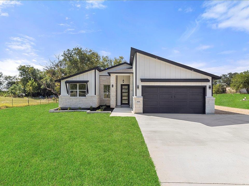 Welcome to this brand-new contemporary home in Seguin, TX, sitting on almost an acre of land with plenty of space for outdoor living, future projects, or simply enjoying the peace and quiet. This home offers 3 spacious bedrooms (Plus a flex room) and 2.5 baths, designed with high-end finishes throughout. From the soft-close cabinetry and porcelain floors to the gourmet kitchen with modern touches, every detail was carefully selected to provide comfort and style. The primary suite is a true retreat, featuring a luxurious stand-up shower and a soaking tub that invites relaxation. High ceilings and open spaces with oversized architectural windows that invite the natural light in and highlight the views and create a warm, light-filled living space. Step outside and you’ll find a large covered patio, perfect for entertaining or enjoying nature at its finest. The property is surrounded by mature trees that provide a beautiful shade and a serene backdrop for gatherings or quiet evenings. Conveniently located near downtown Seguin, close to shopping centers like H-E-B and Walmart, and just a short drive to local lakes, this home gives you both accessibility and privacy. With NO RESTRICTIONS, the possibilities are endless—bring your ideas and make the most out of this large lot. This home is move-in ready and waiting for its new owner to enjoy.
