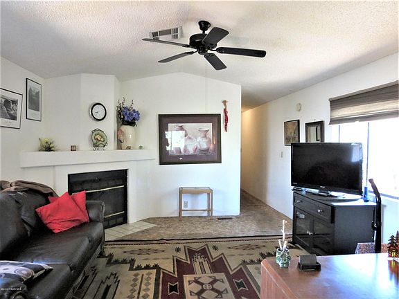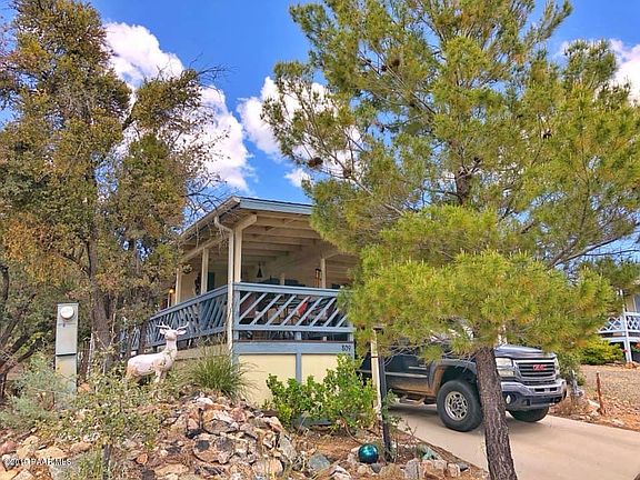 Nestled in the trees, the peace and quiet of this 55+ community make this 2 bed/1 bath a little haven of serenity. An outside sitting area of deck offers views of surrounding hills and mountains. Kitchen needs some tlc. Vaulted ceilings. Living room has a cozy wood-burner fireplace. Outside attached shed offers ample space for storage. All major shopping is within minutes. Movie theater is a jog across highway 69. Downtown Prescott is a quick 5 minute drive. Clubhouse offers full kitchen, weekly activities, pool, spa, and tennis court. Home could use some tlc which makes this a clean slate and a perfect fixer upper. Create your own little paradise to escape the heat with the potential of this sweet little home.